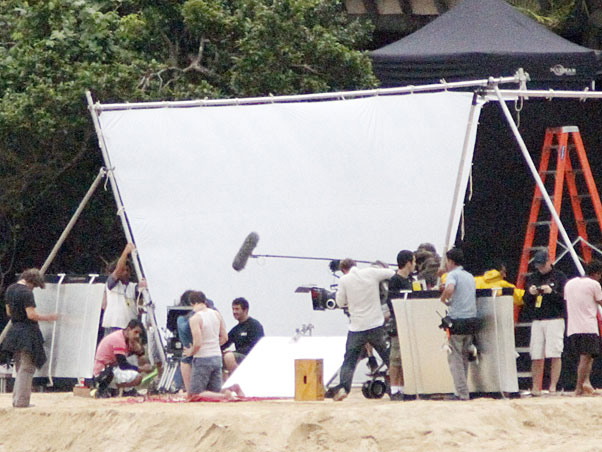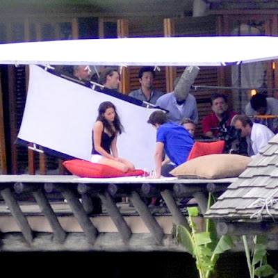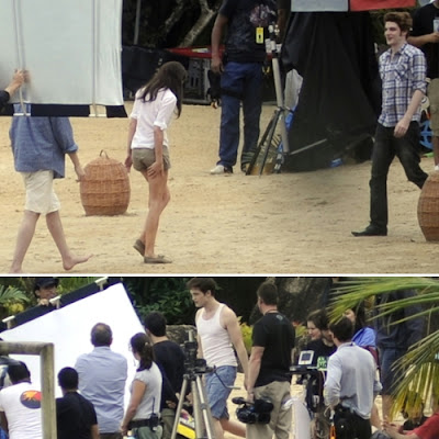Antes de Kristen e Robert entrarem em cena, a produção preparou o local com biombos para tentar impedir os cliques dos paparazzi. Porém, para alegria dos fãs da saga, as cenas de romance foram registradas. Antes de trocarem beijos para a câmera, os dois filmaram jogando xadrez. Apesar da chuva que atingiu a região nesta sexta, Robert e Kristen usavam trajes de verão: ele de regata e ela de shortinho.